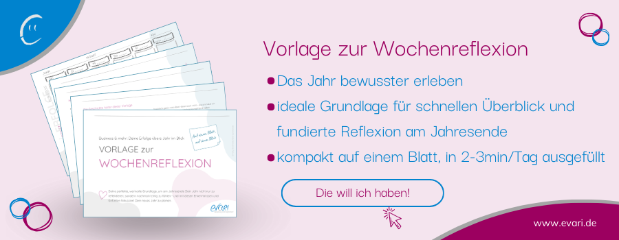 Zur letzten Frage ein Impuls: Ich notiere seit einigen Tagen in meiner Tagesreflexion am Abend eine Situation, in der ich bewusst eine Entscheidung getroffen habe. Dazu nutze ich übrigens die neue Wochenreflexions-Vorlage, die ich für mehr Klarheit in meiner Jahresreflexion entwickelt habe und die Du sehr gern auch nutzen kannst.